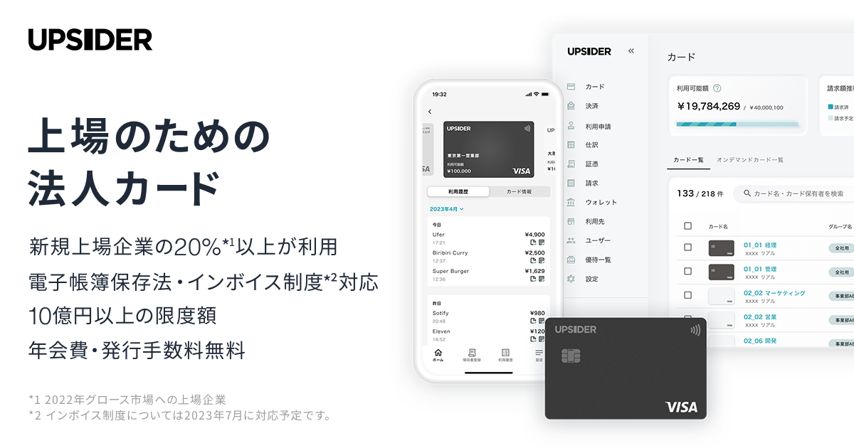 新規上場企業の20%以上※がUPSIDERカードを選択しており、急成長企業のニーズに応える機能性の高さが証明されています。