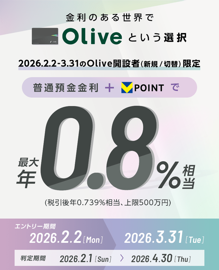| Olive切替&条件達成 | 既存口座からOliveへの切替と残高条件(5万円以上)達成で、もれなく5,000円相当のVポイントがもらえます 。 | 2026年2月2日~2026年4月30日 |