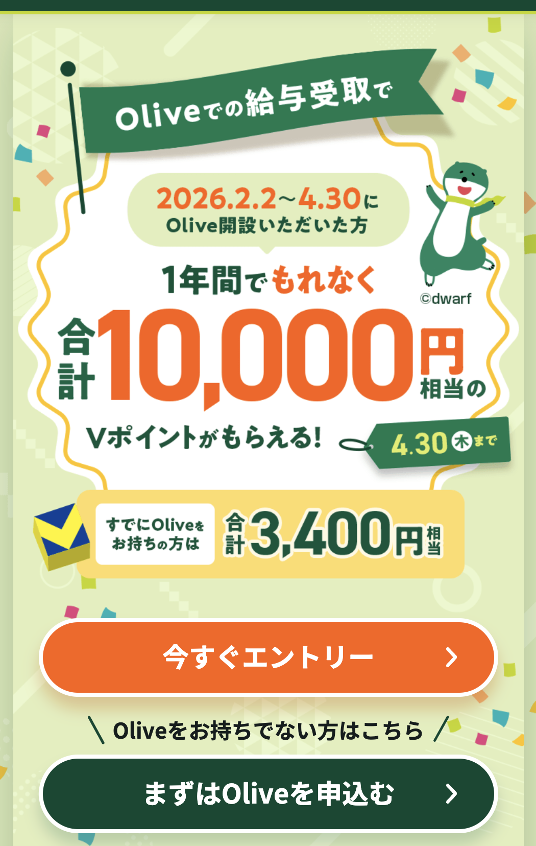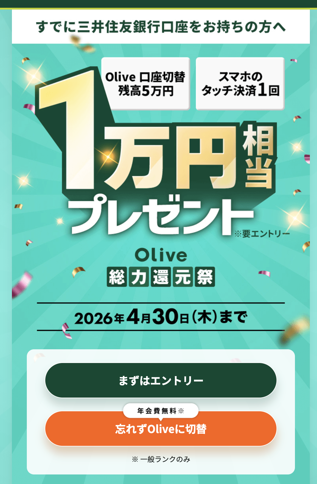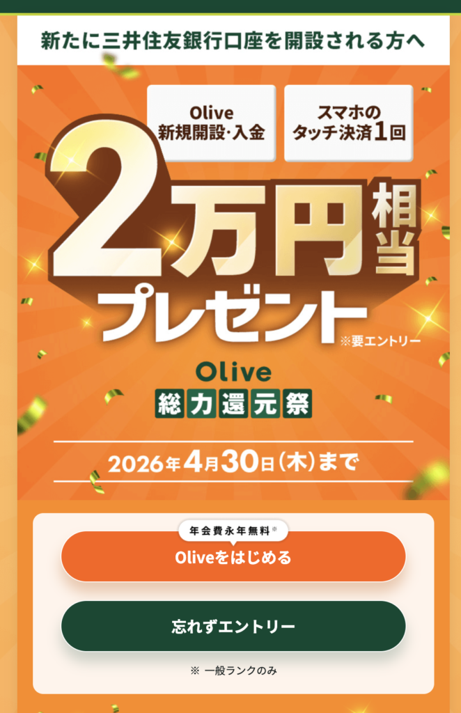| Olive新規口座開設&条件達成で2万円相当プレゼント!Olive総力還元祭 | 口座開設と10万円入金で15,000円相当のVポイント+タッチ決済利用でランクに応じたVポイントPayギフト(最大1万円分)が付与されます 。 | 2026年2月2日~2026年4月30日 |