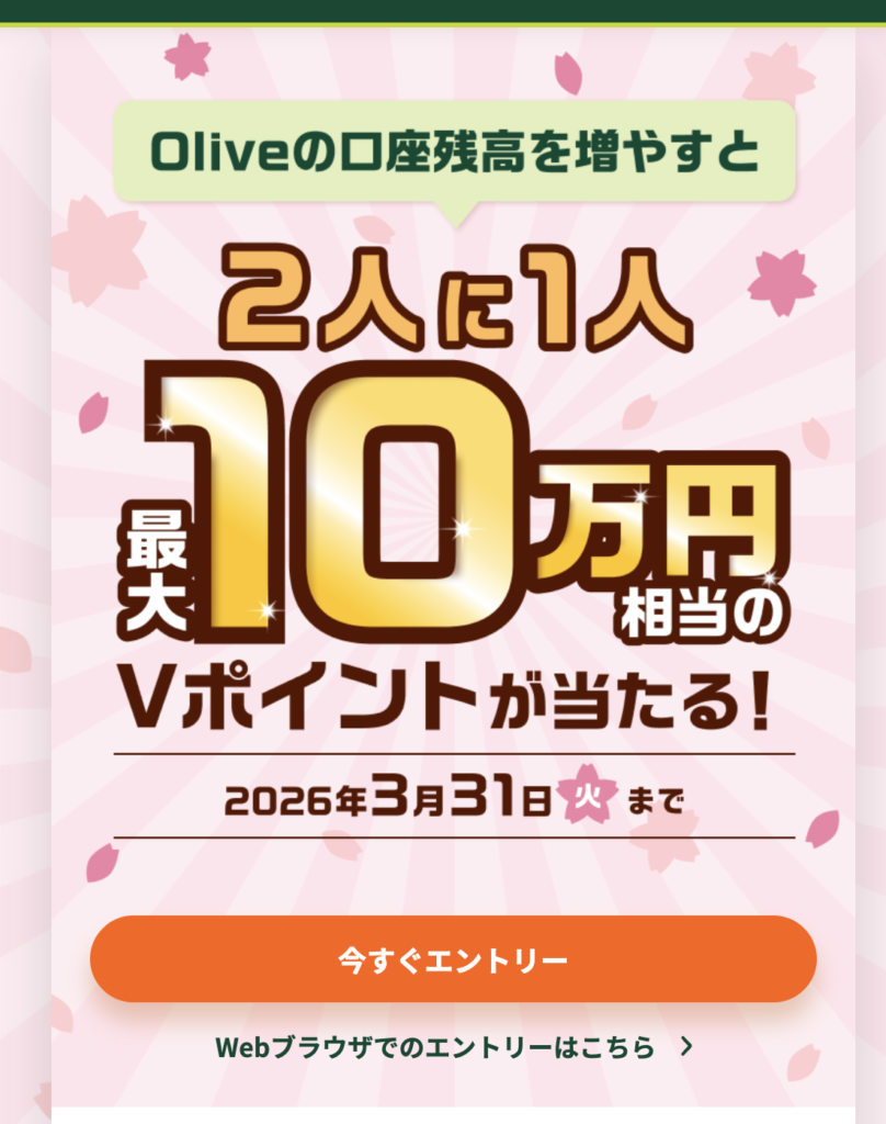 | Oliveの口座残高を増やすと2人に1人最大10万円相当当たる|Oliveの預金お引越しキャンペーン | 抽選で1等10万円相当(100名)、2等1,000円相当(1,000名)、3等10円相当のVポイントが当たります 。 | 2026年3月2日~2026年3月31日 |