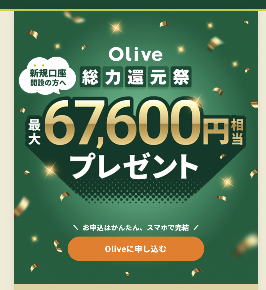 | 対象者 | Oliveアカウントを初めて開設する方 (※既存口座からの切替・過去の申込者は対象外) |