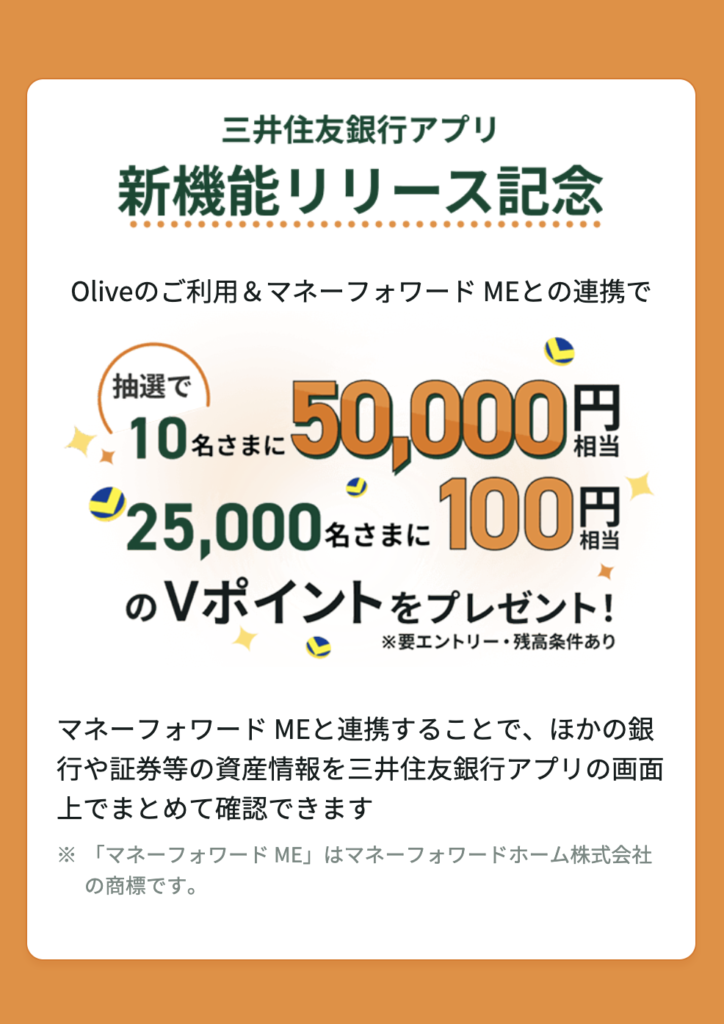 | 三井住友銀行アプリ新機能リリース記念!マネーフォワード MEとの連携キャンペーン | 抽選で1等50,000円相当(10名)、2等100円相当(25,000名)のVポイントが当たります 。 | 2026年3月2日~2026年3月31日 |
