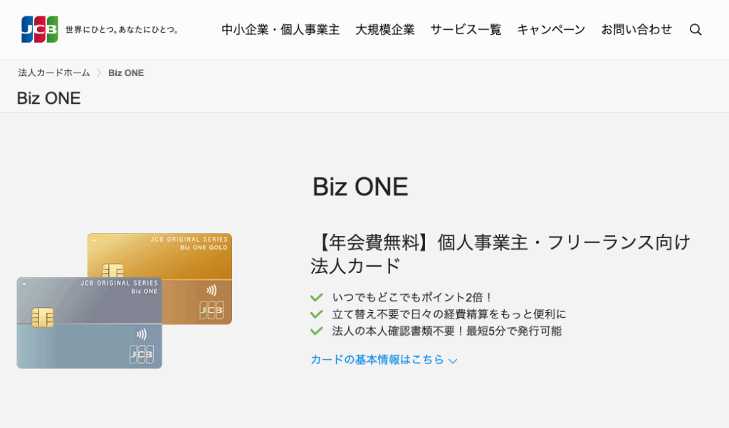 ![]() JCB Biz ONE | 無料 / 発行不可 / 無料 | なし | 1.0% | - | 資金管理サービス「Cashmap」 |