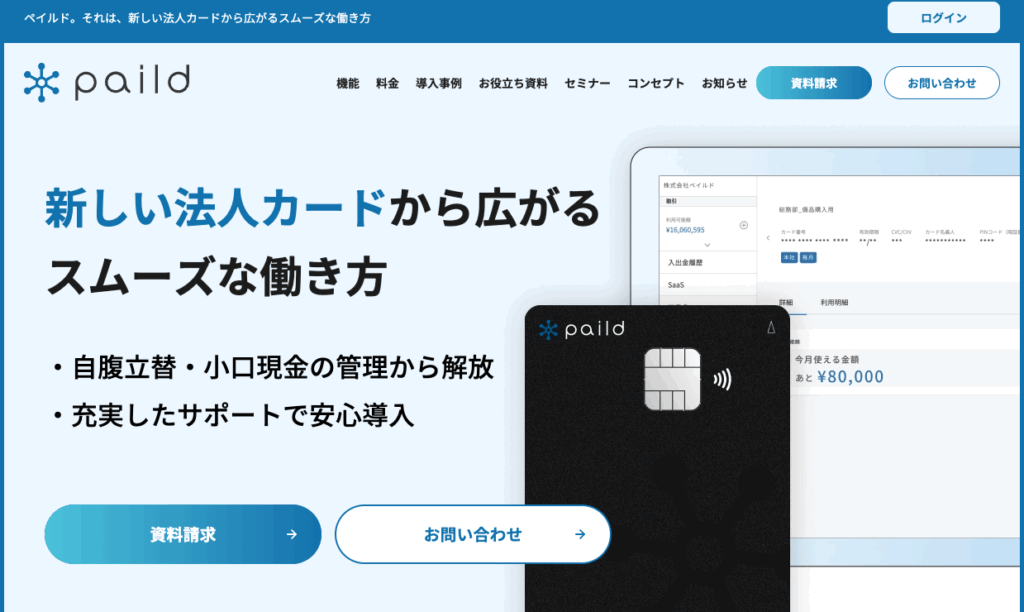 ![]() paild(ペイルド) | 月次の上限はなくウォレット残高に依存 | 与信審査なし | リアルカード発行手数料は30枚まで無料、それ以降は1枚1,400円(税抜) | 不明 | 利用しているサービスやツールを一覧で把握 | 法人 |