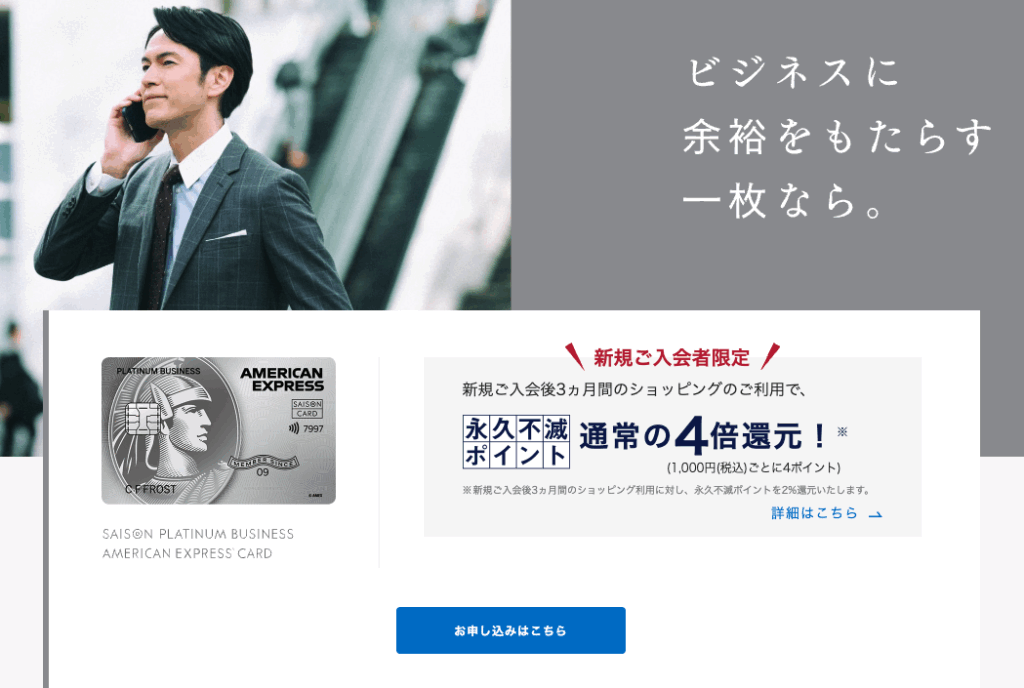 例えば、「セゾンコバルト・ビジネス・アメリカン・エキスプレス・カード」は、特定のウェブサービス利用時にポイントが4倍(還元率2%相当)に跳ね上がります。